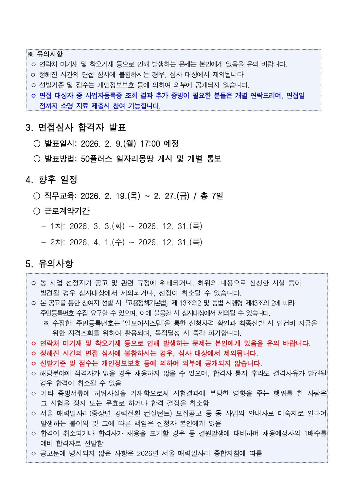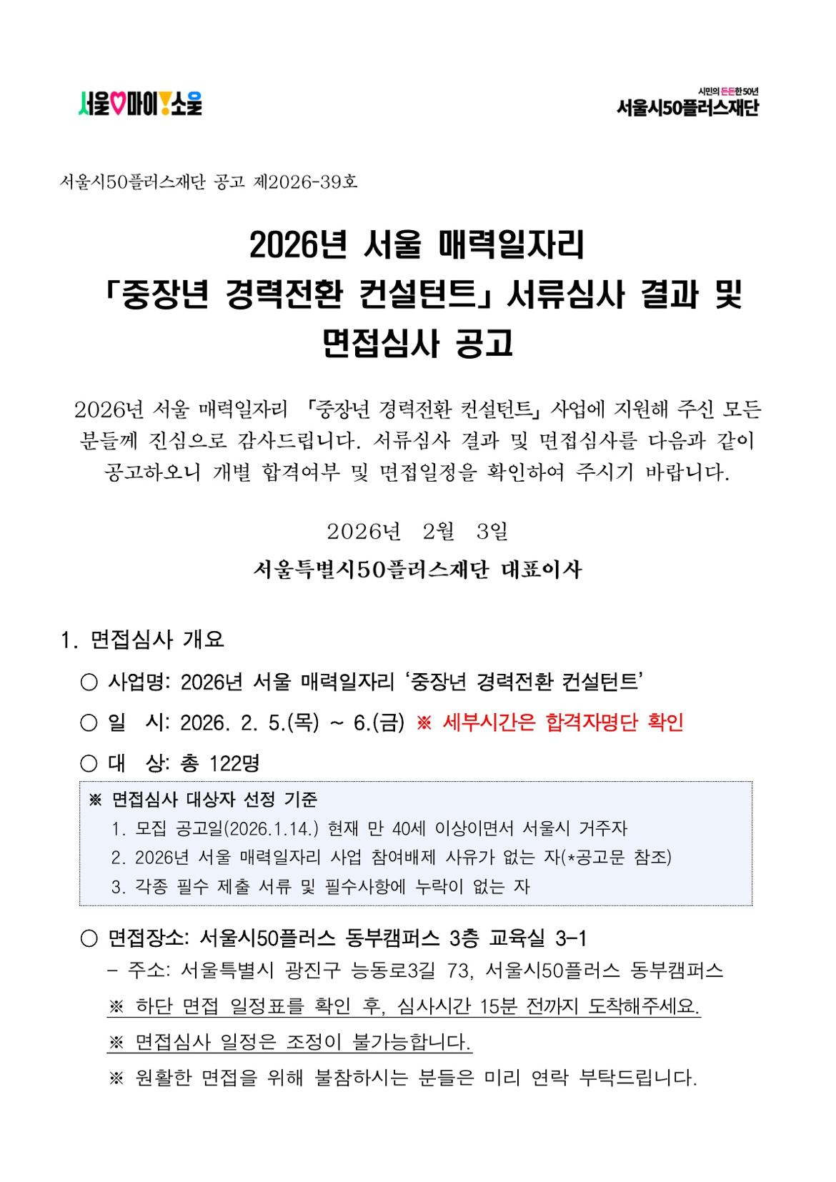 [일자리정보몽땅]2026년 서울 매력일자리 「중장년 경력전환 컨설턴트」서류심사 결과 및 면접심사 공고