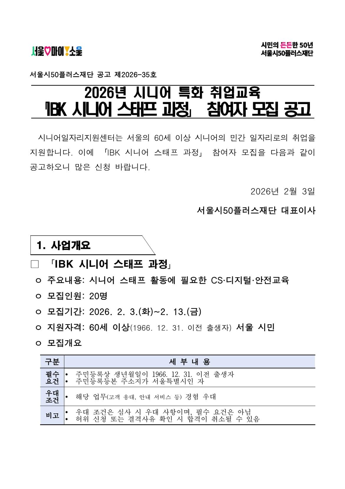 2026년 시니어 특화 취업교육 「IBK 시니어 스태프 과정」 참여자 모집 공고마감 D-9