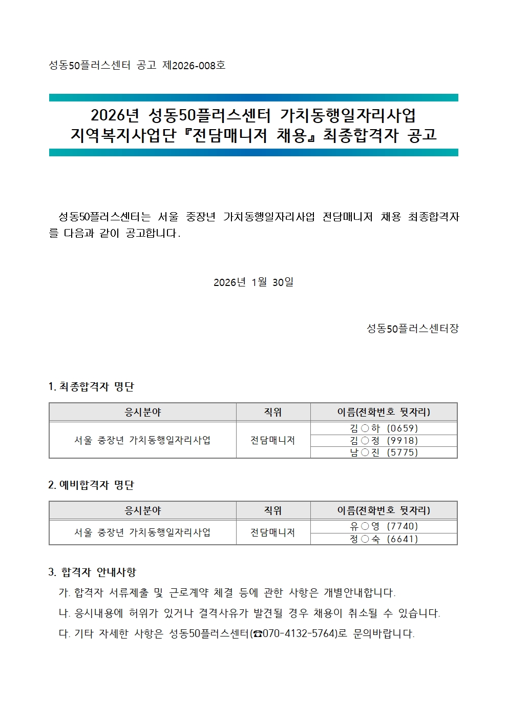 서울시 성동센터 | 2026년 성동50플러스센터 가치동행일자리사업 지역복지사업단 『전담매니저 채용』 최종합격자 공고