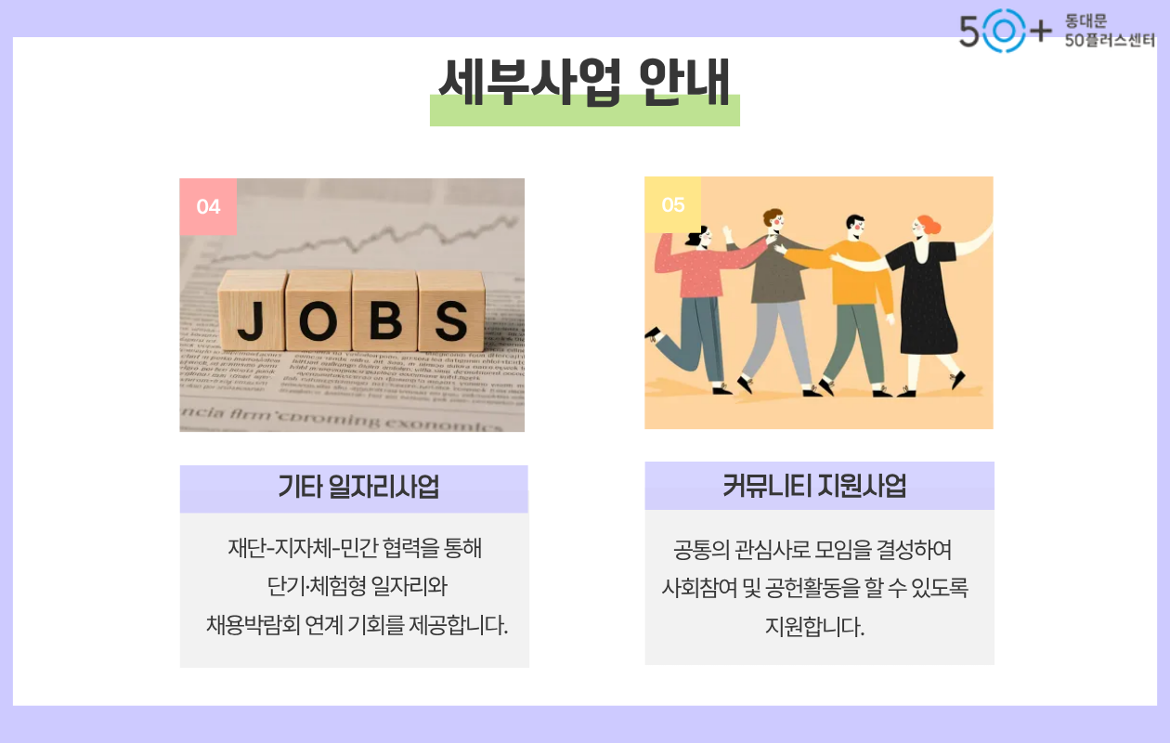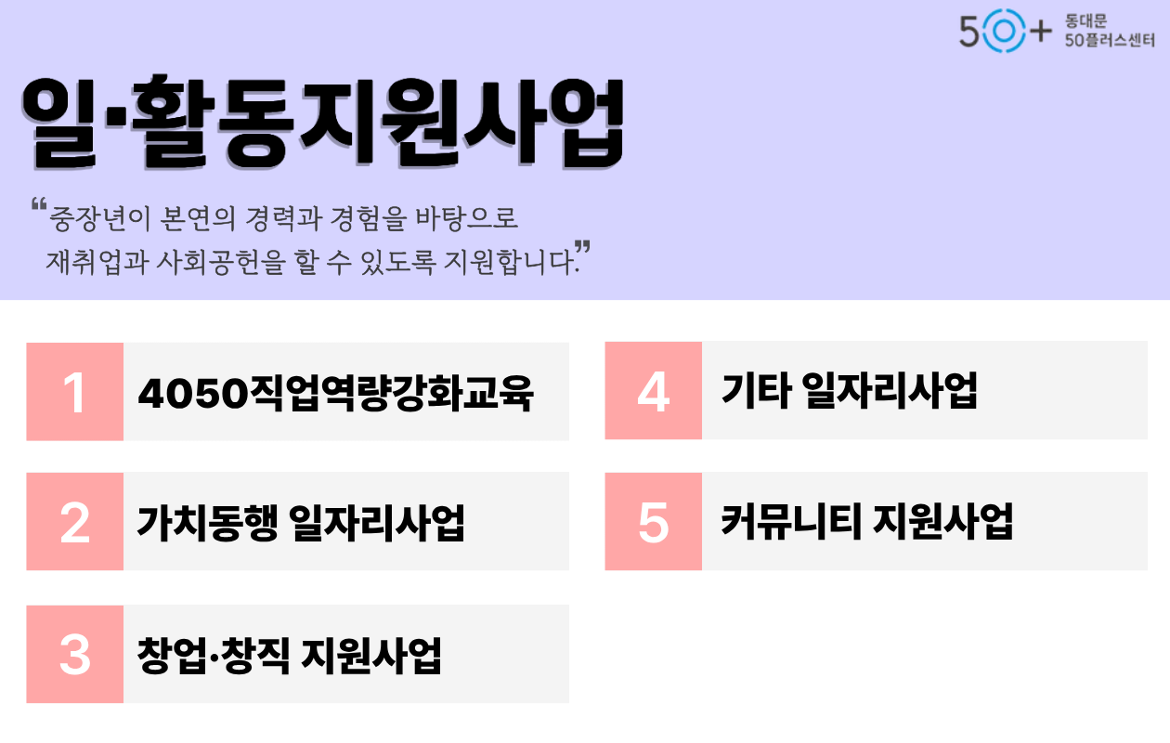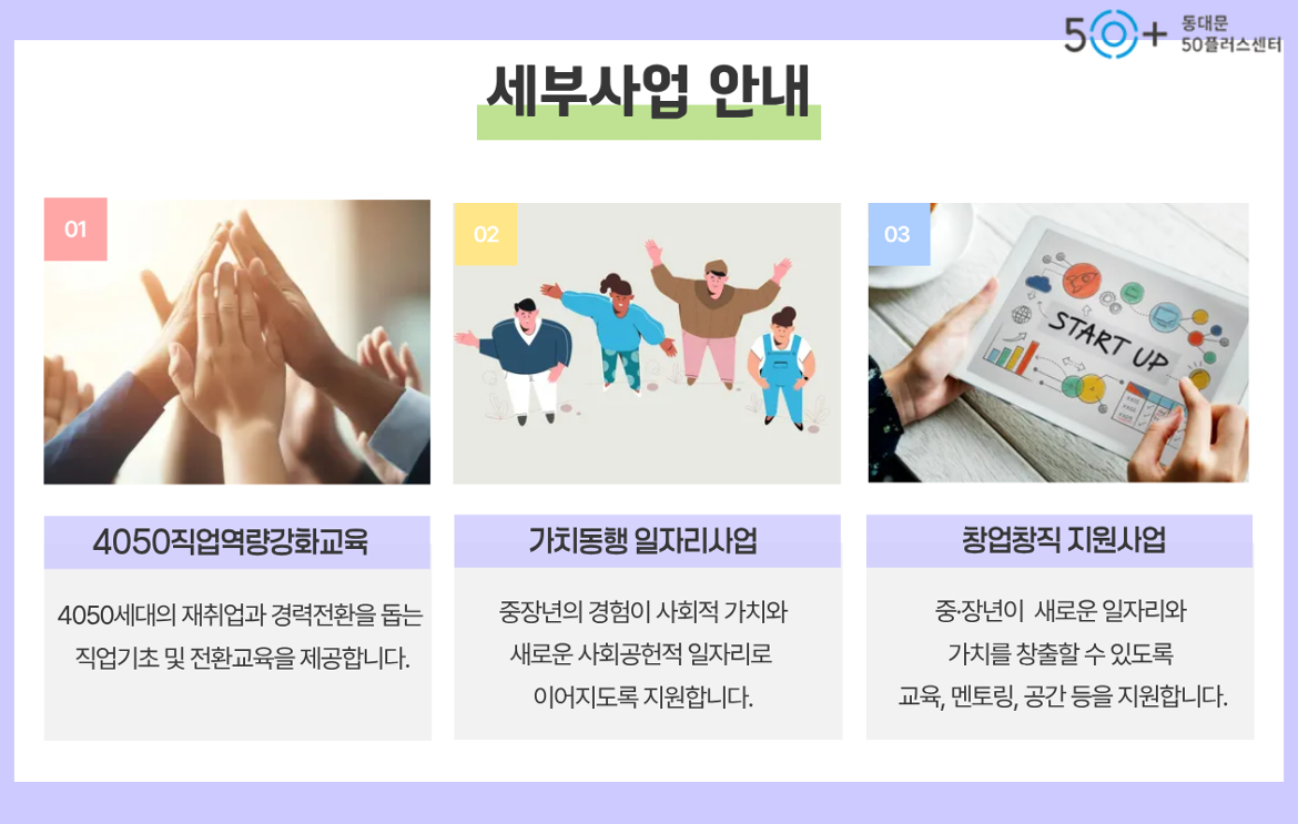 동대문50플러스센터 서울특별시 동대문구 외대역동로5길 18 사업자등록번호 : 174-82-81708 (대표자:이재근)