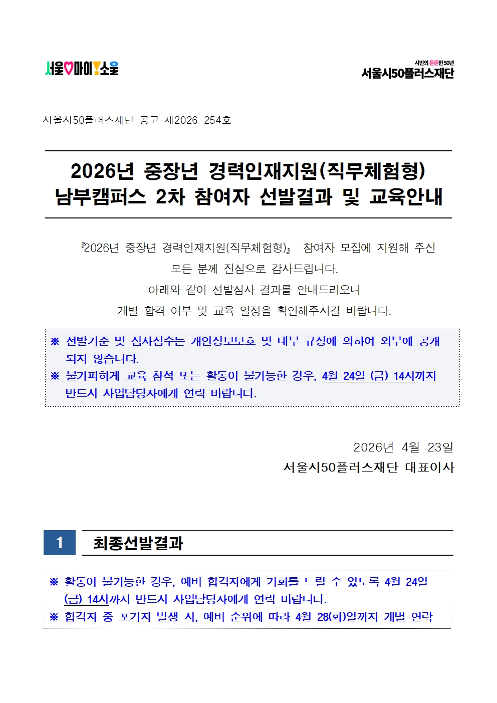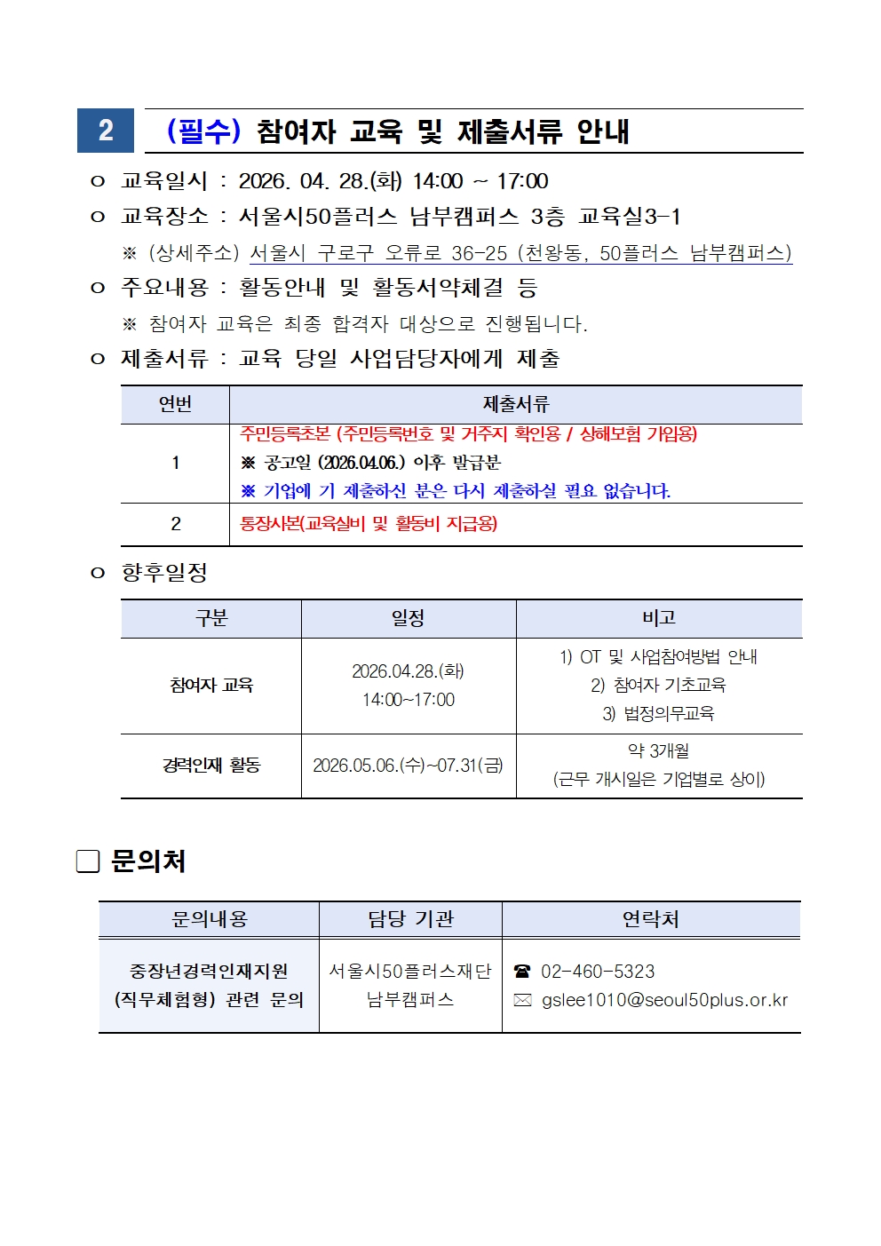 [일자리정보몽땅][남부] 중장년 경력인재지원(직무체험형) 2차 참여자 선발결과 및 교육안내
