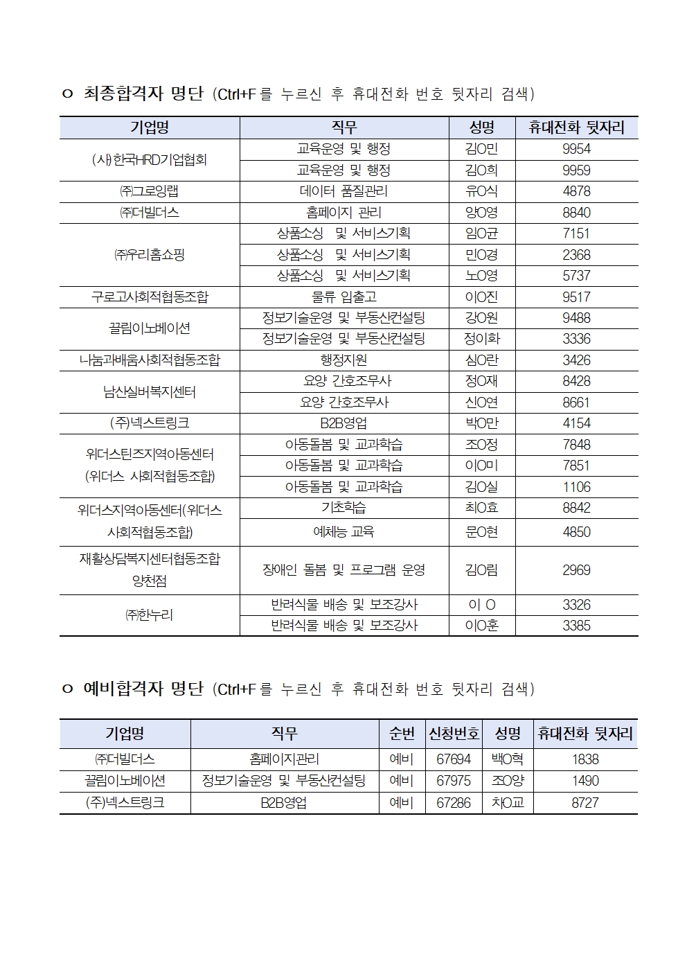 합격자 발표명단 표