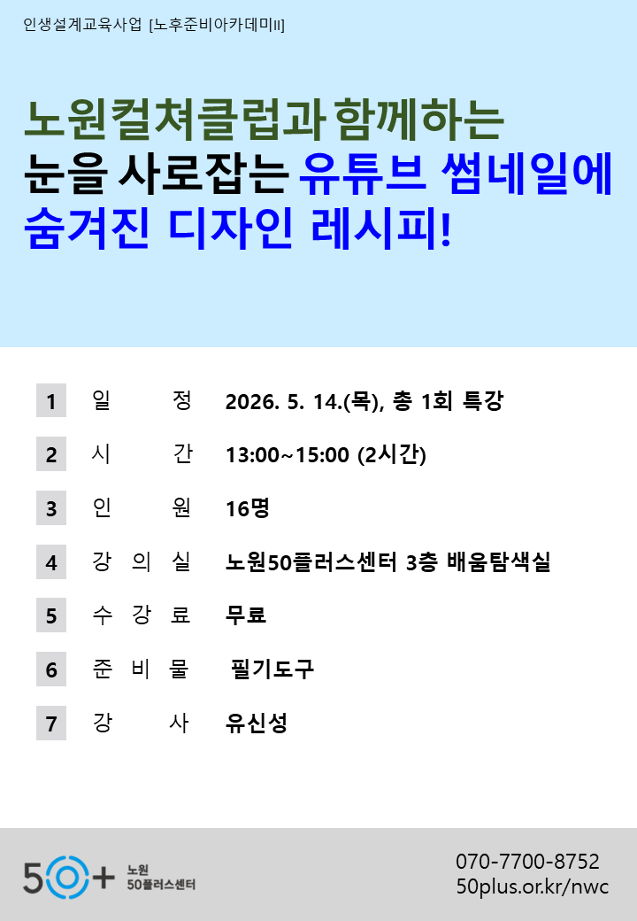 [노원][인큐품앗이][노원컬쳐클럽] 눈을 사로잡는 유튜브 썸네일에 숨겨진 디자인 레시피!마감 D-19