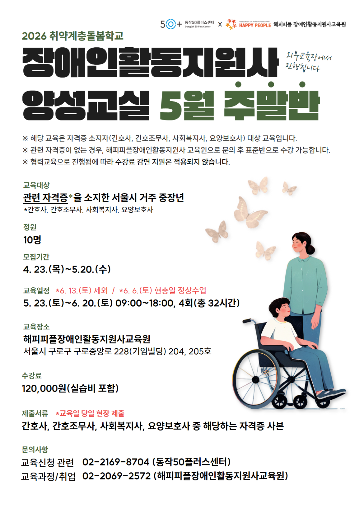[동작]장애인활동지원사 양성교실 5월(주말반)마감 D-27