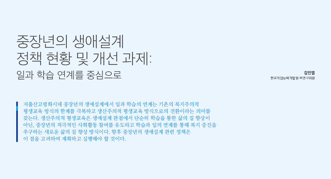 저출산고령화시대 중장년의 생애설계에서 일과 학습의 연계는 기존의 복지주의적 평생교육 방식의 한계를 극복하고 생산주의적 평생교육 방식으로의 전환이라는 의미를 갖는다. 생산주의적 평생교육은 생애설계 관점에서 단순히 학습을 통한 삶의 질 향상이 아닌, 중장년의 적극적인 사회활동 참여를 유도하고 학습과 일의 연계를 통해 복지 증진을 추구하는 새로운 삶의 질 향상 방식이다. 향후 중장년의 생애설계 관련 정책은 이 점을 고려하여 계획하고 실행해야 할 것이다.
