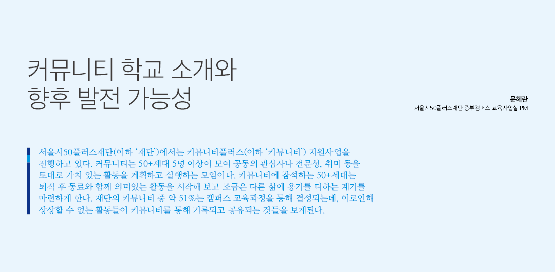 서울시50플러스재단(이하 '재단')에서는 커뮤니티플러스(이하 ‘커뮤니티’) 지원사업을 진행하고 있다. 커뮤니티는 50+세대 5명 이상이 모여 공동의 관심사나 전문성, 취미 등을 토대로 가치 있는 활동을 계획하고 실행하는 모임이다. 커뮤니티에 참석하는 50+세대는 퇴직 후 동료와 함께 의미있는 활동을 시작해 보고 조금은 다른 삶에 용기를 더하는 계기를 마련하게 한다. 재단의 커뮤니티 중 약 51%는 캠퍼스 교육과정을 통해 결성되는데, 이로인해 상상할 수 없는 활동들이 커뮤니티를 통해 기록되고 공유되는 것들을 보게된다.