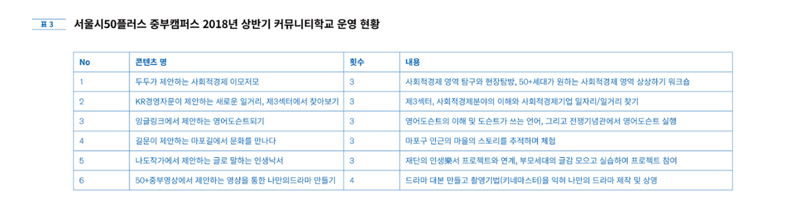 서울시50플러스 중부캠퍼스(이하 중부캠퍼스’)의 커뮤니티플러스(이하 커뮤니티’) 중 약 51%는 교육과정을 통해 결성된다. 교육과정 참여 이후 커뮤니티로 연계되지 않았다면 상상할 수 없는 활동들이 커뮤니티를 통해 기록되고 공유된다.