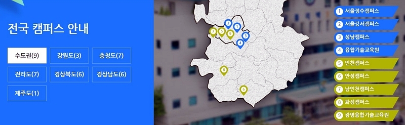 한 캠퍼스에서 모든 교육과정을 개설하는 것은 아니므로 홈페이지에서 과정별 개설 캠퍼스를 잘 확인해야 합니다. 서울 지역에는 한국폴리텍Ⅰ대학 산하의 서울정수캠퍼스(용산구), 서울강서캠퍼스(강서구)가 운영되고 있습니다.