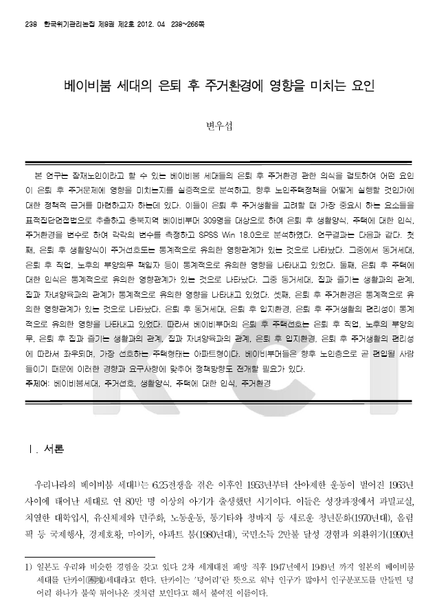 베이비붐 세대의 은퇴 후 주거환경에 영향을 미치는 요인