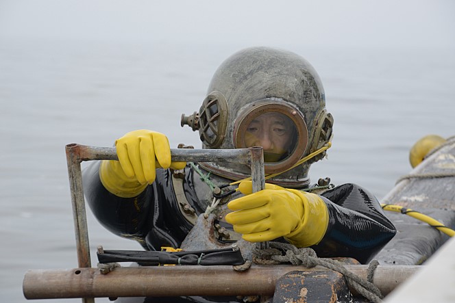 60킬로에 달하는 무게의 잠수복을 머구리는 견뎌내야 합니다.