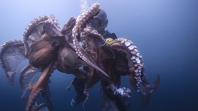 바다 속에서 초대형 문어와 사투를 벌이는 머구리,