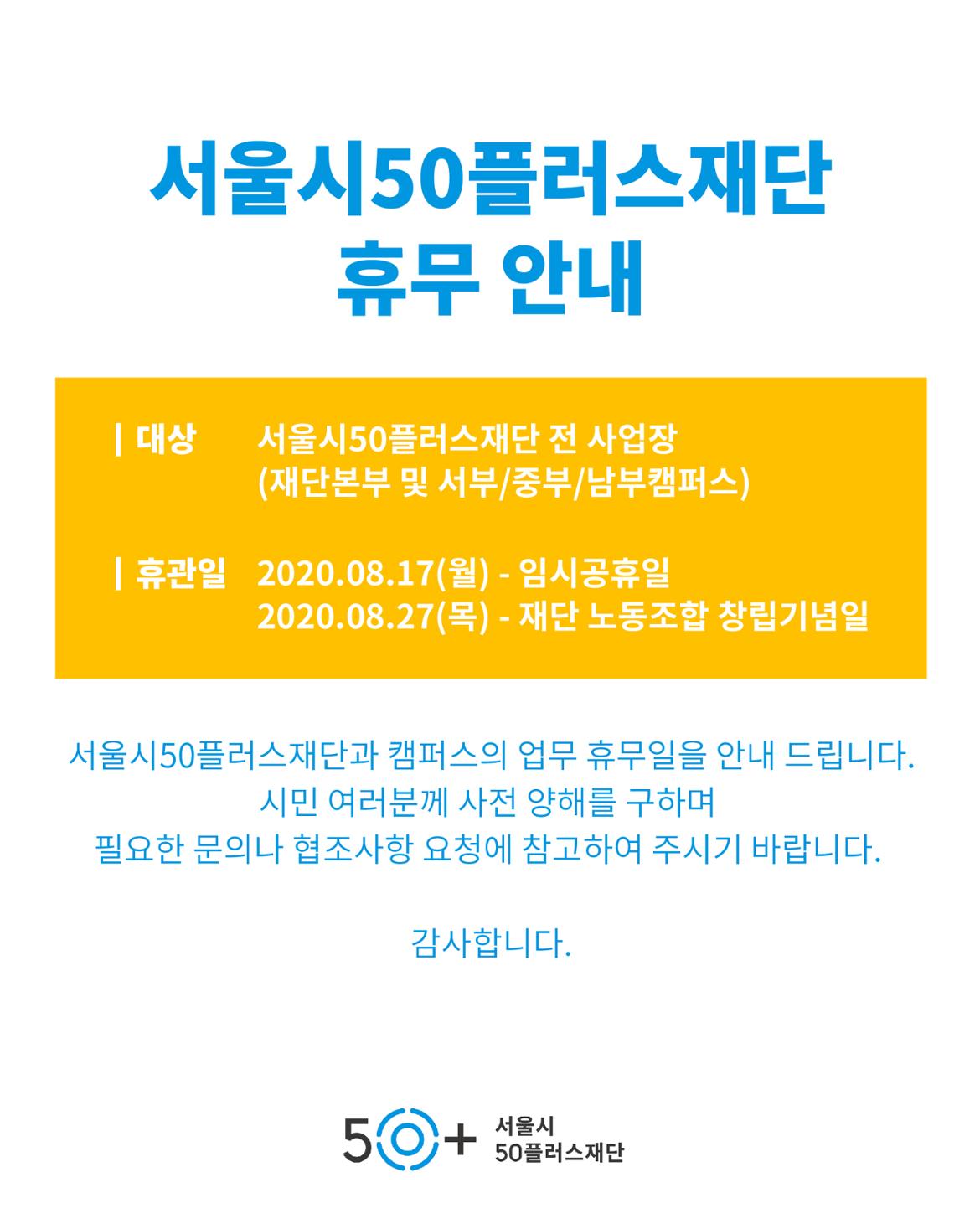 [재단]서울시50플러스재단 휴무 안내(8/17, 8/27)
