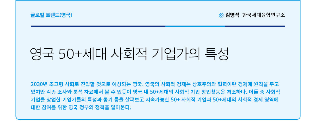 영국 통계청(ONS: Office of National Statistics)의 2018년 통계를 보면 2020년 50+세대(50세~64세)는 약 1,300만 명으로 6,680만 명인 영국 전체인구의 19.34%를 차지한다. 또 다른 조사에 따르면 50+세대는 다른 연령대와 비교해 사회적 경제영역에 참여하는 비율이 낮은 것으로 나타났다(GEM 2009). 영국 사회적 경제 지원기관 언리미티드(UnLtd)의 조사에 따르면 사회적 기업을 위한 사회적 기업가 대상의 각종 수상자 중에서 2003년 이후 50세 이상은 18%(50대 13%, 60세 이상 5%)에 불과하다. 이는 50+세대가 젊은 연령대보다 사회적 기업 창업에 소극적이라는 것은 당연한 것처럼 보일 수 있지만 이와는 반대로 50~74세 사이의 사람들이 정기적인 자원봉사에 가장 많이 참여할 가능성이 있는 집단이라는 다른 연구결과도 있다(2008~09 Citizenship Survey).