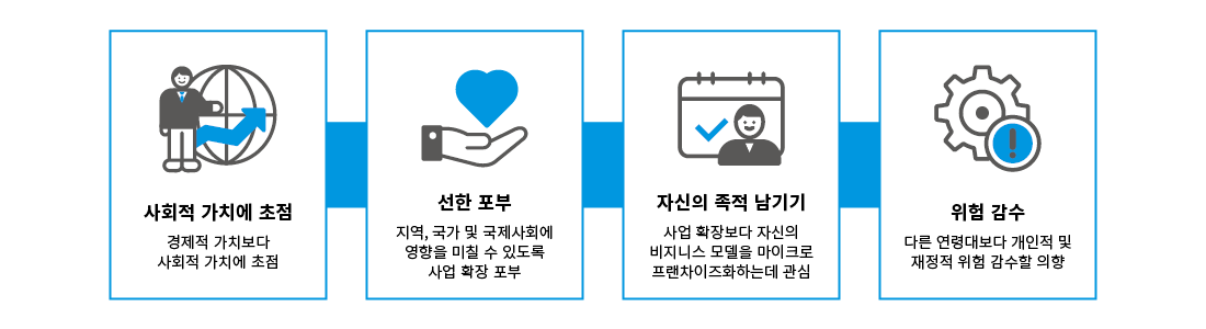 50+사회적 기업가들은 젊은 사회적 기업가들과 달리 상업적 성격의 비즈니스 모델보다는 자선적(박애주의적)인 비즈니스 모델을 지향한다. 사업을 확장하기 위해 사업 능력을 개발하는 것보다 다른 사람들이 그들의 비즈니스 모델을 모방하고 복제하여 동일한 형태의 사업이 확대되는 것에 더 관심이 있다.