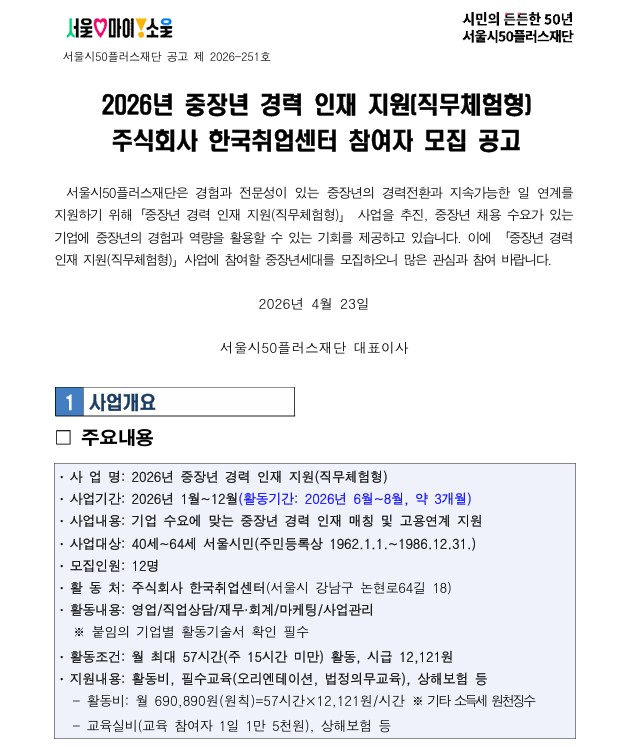 [북부] 중장년 경력 인재 지원(직무체험형) 참여자 모집(주식회사 한국취업센터)마감 D-18