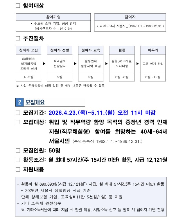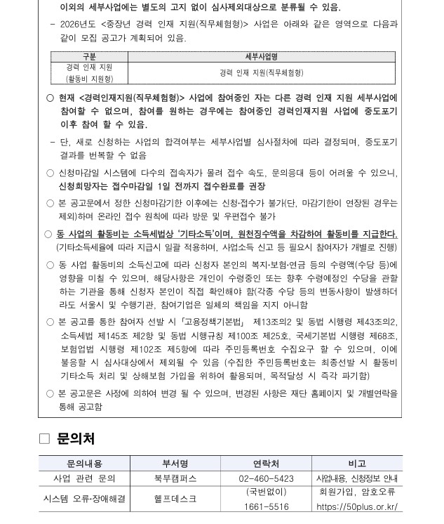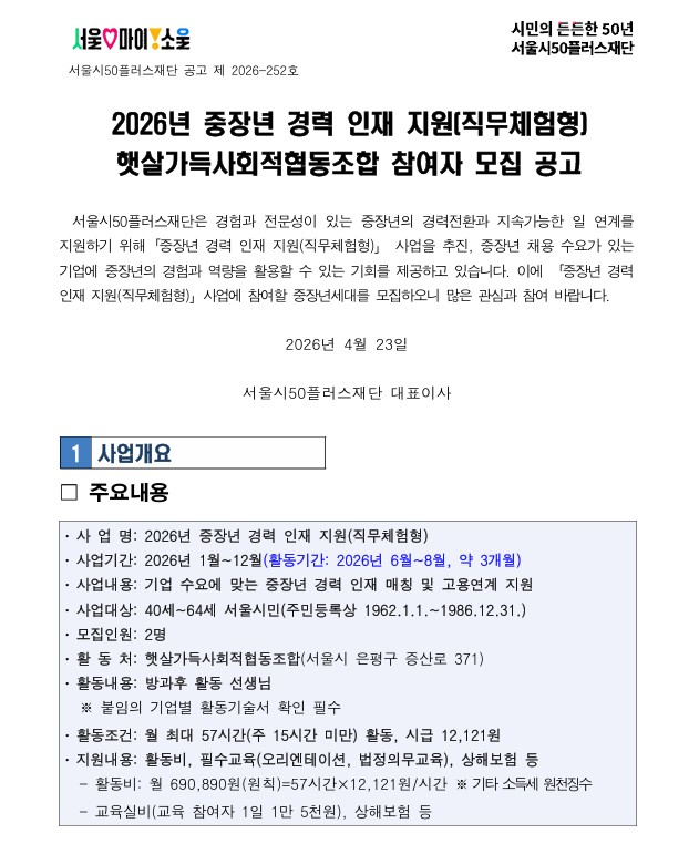 [북부] 중장년 경력 인재 지원(직무체험형) 참여자 모집(햇살가득사회적협동조합)마감 D-18