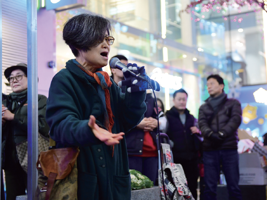 작은 체구에 은빛 단발을 한 여자가 바람 부는 거리에 나타난다. 아직 조금은 쌀쌀한 날씨. 길 위에 선 여자는 뭔가 투덕거리더니 마이크를 집어 들고 청중 앞에 선다. 잔잔하게 선율이 흐르면 그녀의 인생이 담긴 목소리가 터져 안기다 마음속에 녹아든다. 바삐 가던 이의 속도가 느려지고 뒤를 돌아본다. 그리고 귀 기울인다. 그녀의 마법에 하나, 둘 빠져들더니 멈춰서는 발걸음, 또 발걸음. 길 위의 예술가 한복희(韓福姬·58) 씨의 노래가 울려 퍼지면 모두가 판타지 속의 주인공이 되고 만다.