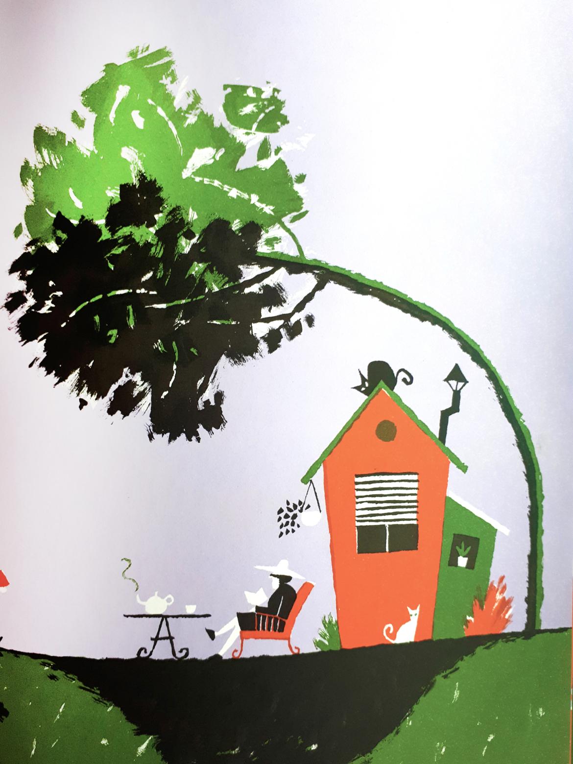 작은 집과 마당에 놓인 테이블, 찻잔, 졸고 있는 모자 쓴 할머니와 고양이들의 나른하고 평화스런 모습이 부럽기도 하고 좋다. 제일 맘에 드는 장면은 부자 아저씨가 문득 발견하는 할머니의 두 눈이 크게 확대된 장면이다. 두 눈가의 잔주름이 마치 왼쪽 눈과 오른쪽 눈에 담긴 작은 나무와 큰 나무를 이어주고 있는 듯하다. 실제론 이렇게 나무 한그루씩 따로 담아내는 눈은 없겠지만, 그 장면 하나로 할머니의 심성과 작가의 메시지를 충분히 느낄 수 있다.