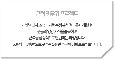 ‘근력 키우기 프로젝트’는 50+ 세대의 가장 큰 관심사인 건강, 그중에서도 근력을 강화하기 위한 프로그램이다. 올해 봄 학기에 '나의 몸 이해와 다양한 운동'으로 개설되었고, 이번 학기에는 근력 강화 운동을 위주로 다시 기획되었다. 매주 2회 2시간씩, 총 9회에 걸쳐 집중적으로 근력 강화 운동을 한 후 근육이 강화된 것을 치수로 확인한다.