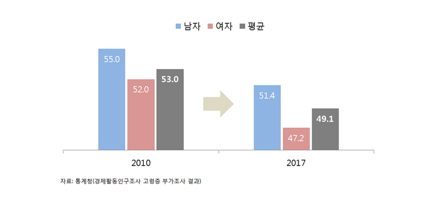 이쯤에서 우리나라가 100세 시대로 진입하고 있다는 사실은 받아들이도록 하자. 그렇다면 다음으로 나올 질문은 오래 살면 오래 일해야 하는 것 아닌가일 것이다. 말이야 맞는 말이지만 현실은 그렇지 않다는데 문제의 심각성이 더 크다. 2016년부터 시작된 정년 60세가 2017년부터 전 사업장으로 확대 시행되고 있지만 실제로 60세까지 근무하는 경우는 공무원과 일부 공기업뿐이다. 통계청의 조사에 따르면 가장 오래 근무한 일자리, 즉 주된 직장을 그만둘 당시의 연령은 2017년 5월 현재 평균 49.1세에 불과하다. 남자가 51.4세, 여자가 47.2세로 남자가 4세 정도 더 많다. 2010년대 초반만 하더라도 평균 53세(남자 55세, 여자 51세)이던 것에서 갈수록 더 빨라지는 추세를 보이고 있다.