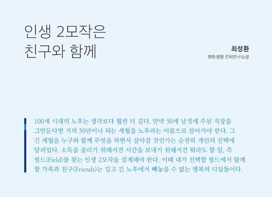 100세 시대의 노후는 생각보다 훨씬 더 길다. 만약 50세 남짓에 주된 직장을 그만둔다면 거의 50년이나 되는 세월을 노후라는 이름으로 살아가야 한다. 그 긴 세월을 누구와 함께 무엇을 하면서 살아갈 것인가는 순전히 개인의 선택에 달려있다. 소득을 올리기 위해서건 시간을 보내기 위해서건 뭐라도 할 일, 즉 필드(Field)를 찾는 인생 2모작을 설계해야 한다. 이때 내가 선택할 필드에서 함께 할 가족과 친구(Friends)는 길고 긴 노후에서 빼놓을 수 없는 행복의 디딤돌이다.
