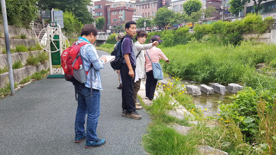 50+전문사회공헌단 육성지원사업 하천생태모니터링 사업단이 성북천 생태모니터링을 위해