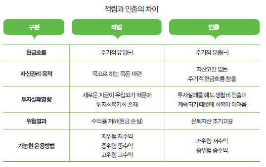 인출(withdrawal)은 이런 소득을 안정적으로 창출하는 것, 즉 노후에 안정적인 소득흐름을 만드는 행위라 할 수 있다. 3040시절에는 근로 및 사업소득 중 일부를 생활비로 쓰고 나머지는 저축을 했다. 이를 적립(accumulation)이라고 한다. 인출은 3040 시절 목돈 형태로 적립해놓은 자금에서 매달 생활비를 안정적으로 빼내 쓸 수 있도록 하는 구체적 수단을 선택하는 행위인 셈이다.