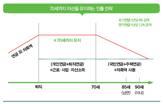 이상을 종합적으로 고려한 인출 방식의 하나는 연금 외 저축액을 70세까지 유지하는 전략이다. 남편은 85세, 아내는 90세에 사망한다고 가정했을 때 퇴직 후 70세까지의 생활비는 사적연금(개인연금+퇴직연금)과 근로·사업·자산소득 등으로 충당하고, 이후는 퇴직 전까지 모아놓은 연금 외 저축 액과 국민연금(필요시 주택연금 포함)으로 생활비를 조달하는 방식이다. 이는 어디까지나 우리나라 은퇴자의 평균적인 자산 상황을 감안한 가장 단순한 모델일 뿐이다. 각자 처해 있는 상황에 따라 전략은 얼마든지 달라질 수 있다.