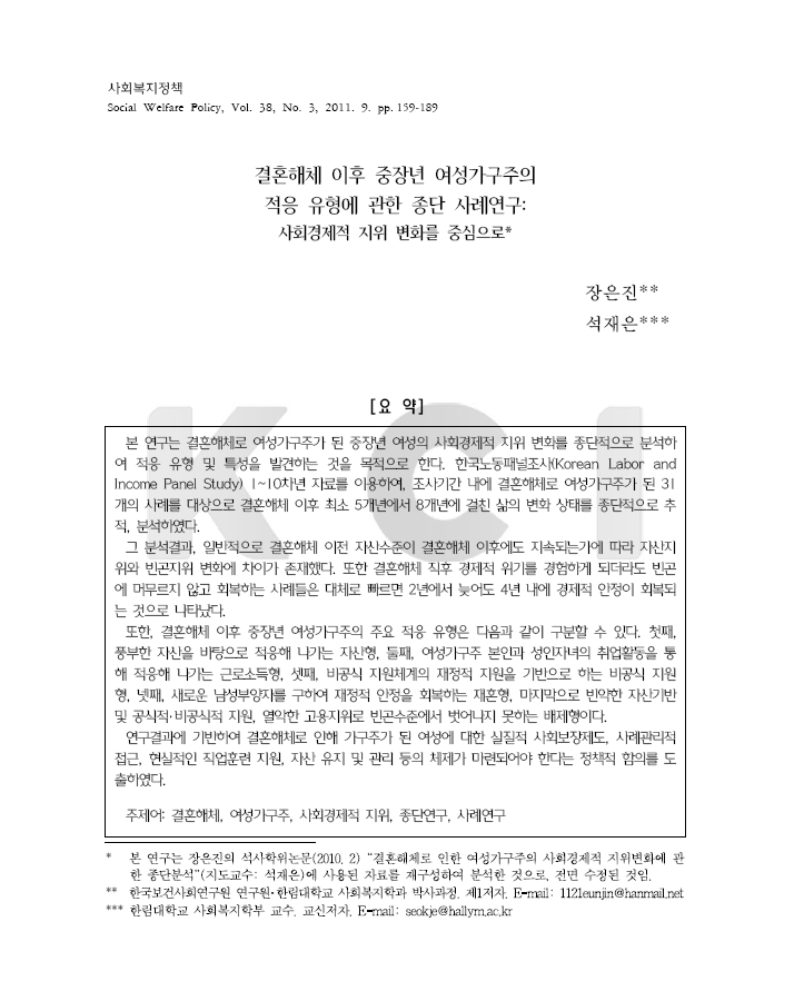 • 결혼해체로 여성가구주가 된 중장년 여성의 사회경제적 지위 변화를 분석해 적응 유형과 특성을 파악하기 위한 연구.
