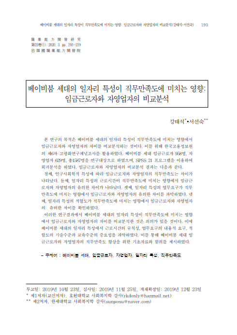 • 2016년 제6차 고령화연구패널조사 결과를 활용해 베이비붐 세대의 일자리 특성이 직무만족도에 미치는 영향을 임금근로자와 자영업자의 차이를 중심으로 비교 분석함.